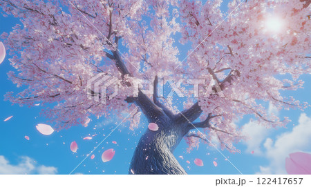 青空の下に広がる満開の桜並木と花びら舞う春の風景