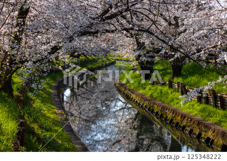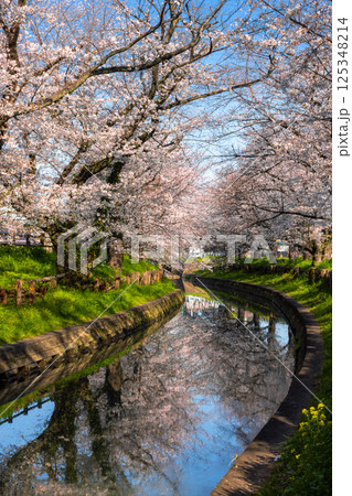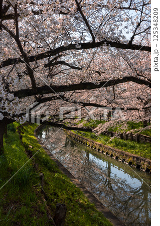 埼玉県川越市氷川町 氷川神社裏の誉桜と呼ばれる新河岸川沿いの桜並木と川面の水鏡