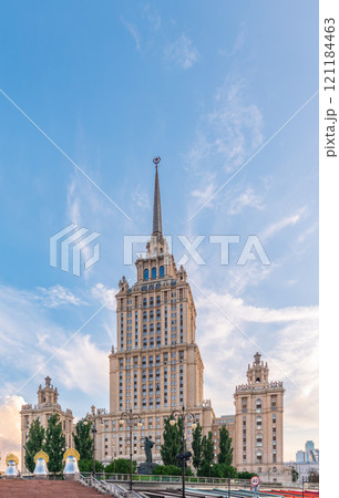 High-rise stalinist building near river at summer sunset in Moscow, Russia. Historic name is Hotel Ukraine.