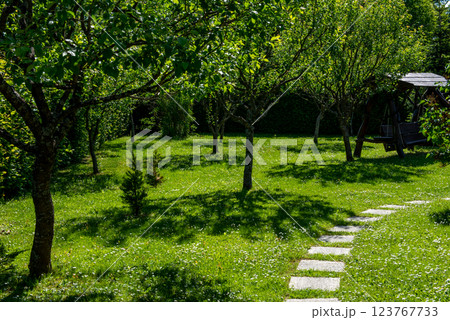 Small green garden with some blooming fruit trees.