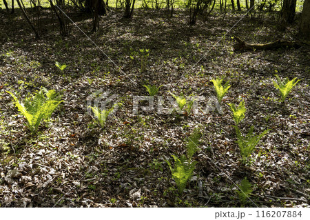 新芽が出たばかりの春の林の下で陽を浴びているクサソテツ
