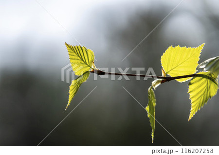 春の陽を浴び葉脈が浮き出ている白樺の新芽