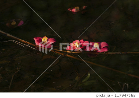 水面に浮かび春の陽を浴びながら枯れていく白椿の花