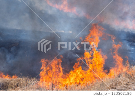 春の風物詩に映える観光・行楽スポット 阿蘇の野焼きクローズアップ風景(俵山)