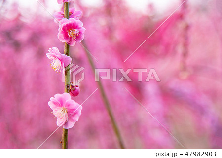 早春の梅の木 ピンクの枝垂れ梅とベンチ