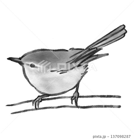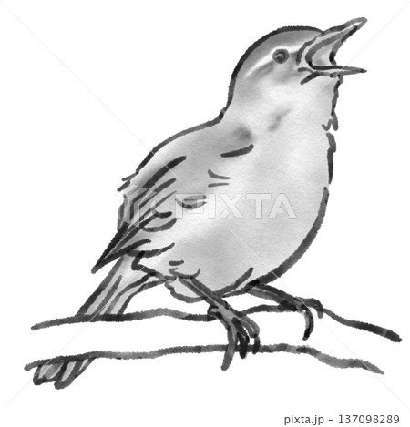 桜の枝にとまるウグイス(墨ペン水彩風)