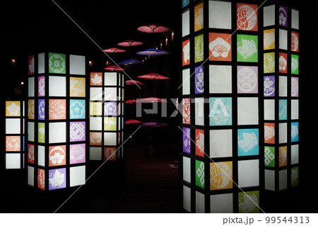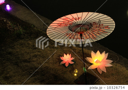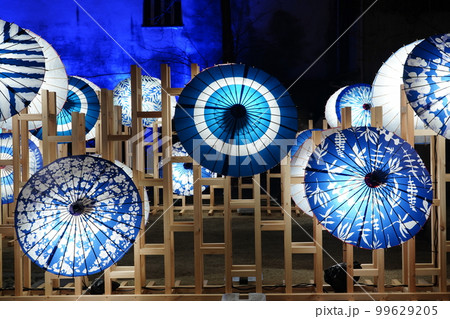 岡山県倉敷市の観光地の美観地区で夜のライトアップされた和傘 倉敷春宵あかり