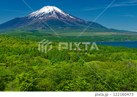 新緑のパノラマ台から見る富士山と山中湖