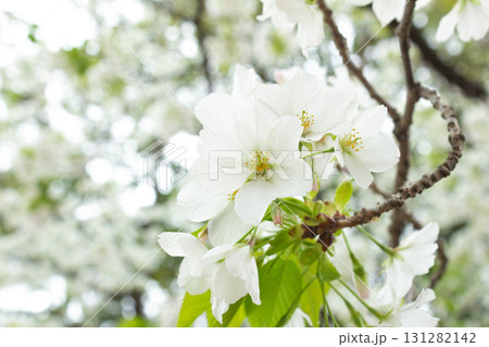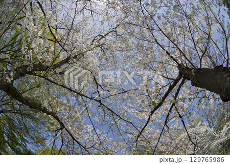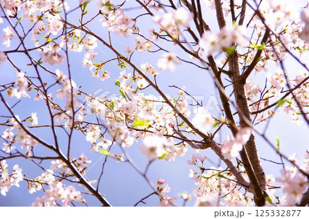 青空の下、ソメイヨシノの桜の花の満開の風景。
