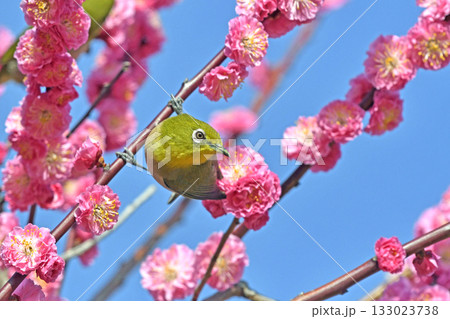満開の紅梅にメジロさん ( 春イメージ )( 春うららかイメージ )