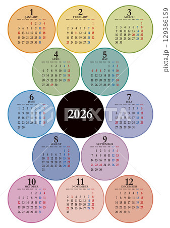 2026年の刺繍文字風年間カレンダー 月曜始まり