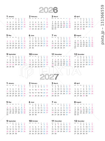 日曜日始まりの2026年から2032年までの年間カレンダー