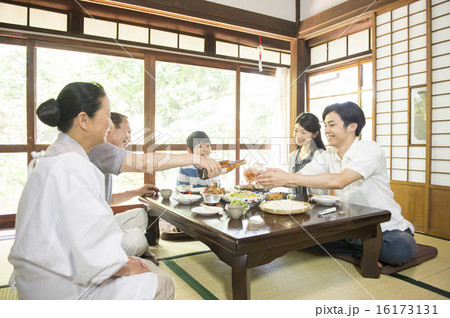 家のダイニング・食卓で食事をする家族・三世代家族・ファミリー