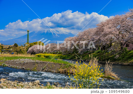 静岡県 富士市 龍厳淵の桜並木と富士山