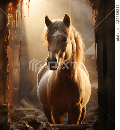 Domestic animal silhouette. Farm lifestyle concept. A powerful horse with a mane stands in the doorway of a barn, showcasing its strong snout