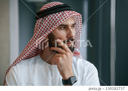 Close up portrait. Successful Muslim businessman in traditional outfit in his office