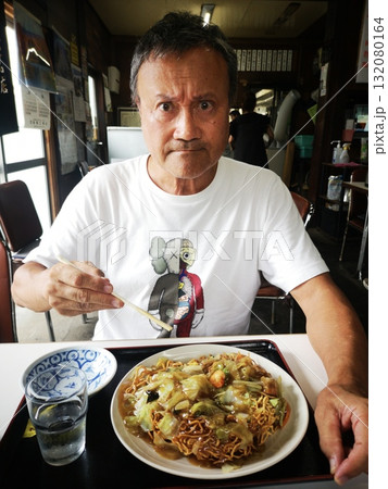 地元の食堂で堅焼きそばを食べるイケメン男性