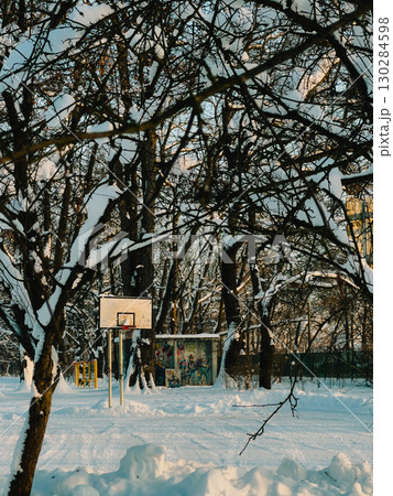 Snow covering basketball court in park during winter, with trees and graffiti wall in background, creating serene and desolate atmosphere. Snow blanketing empty basketball court, surrounding trees
