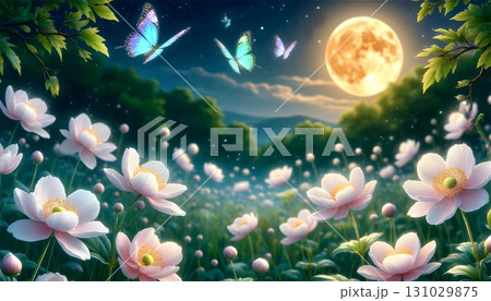 Serene Landscape with Lush Greenery and Vibrant Blooming Flowers Under a Clear Sky