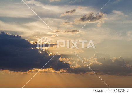 Panorama of sky at sunrise or sunset. Beautiful view of dark blue clouds lit by bright orange yellow sun on clear sky. Beauty and power of nature, meteorology and climate changing concept.
