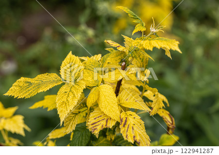 Raspberry plant with yellow leaves, green veins. Nutrient deficiency. Probably lack of iron.