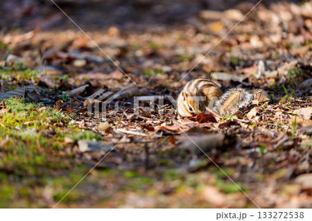 落ち葉の上に立ち頬袋を膨らませたエゾシマリス