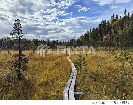 A wooden walkway meanders through the golden grasslands of Paanajarvi National Park, Karelia