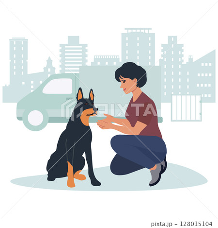 Woman kneeling and interacting with dog in urban setting with buildings and vehicle in background