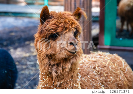 Brown alpaca posing in a snowy farm setting, with hay nestled in its thick fur, gazing to the right. Capturing the charm of this adorable livestock in a winter landscape