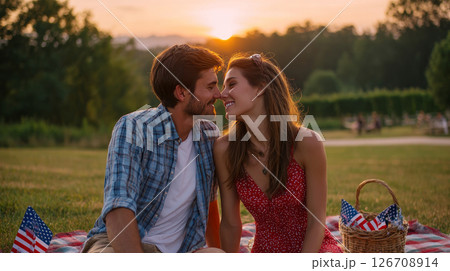 A young couple enjoying a summer sunset picnic with American flag-themed napkins and accessories, peaceful atmosphere. Election Day in the USA. America Day. Festive Mood on President's Day