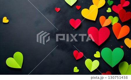 Radiantly colored paper hearts on a black surface, celebrating love and freedom in tribute to Juneteenth