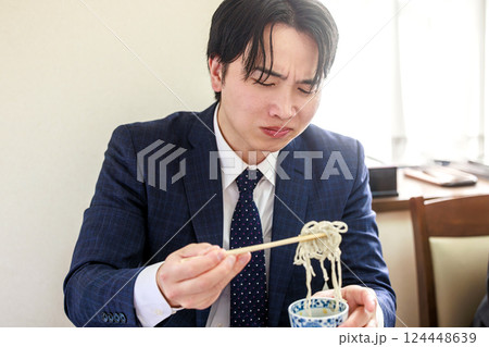オフィスで仕事をしながらカップラーメンを食べるミドル男性
