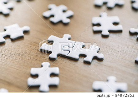 Puzzle pieces are connected. White puzzle pieces on a wooden table background. Business, partner, solution, alliance, union concept.