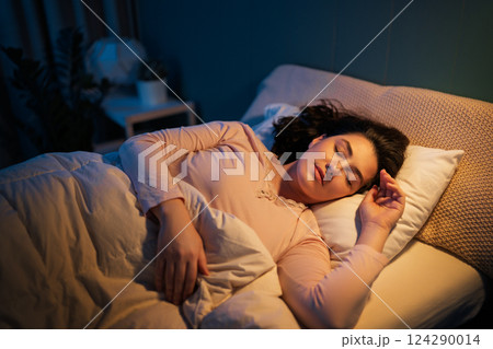 Attractive woman lay on the bed feeling relax and cosy in the morning