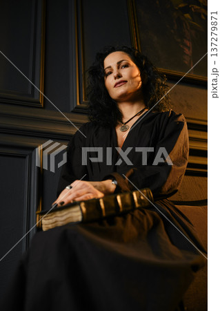 Woman holding a book in a dark room with elegant wall details and soft lighting
