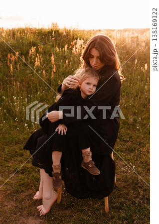 Mother And Child. Calm And Protective Mother Gently Cradles Daughter During Sunset Evening