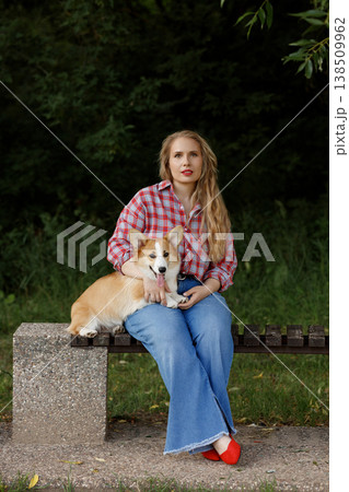 Woman With Dog. Lady Sitting With Beloved Pet. Woman Gently Holding Corgi On Her Lap