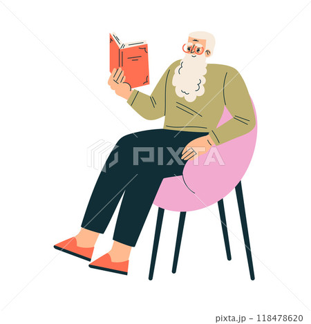 Senior Bearded Man Character Sit on Chair Read Book Vector Illustration