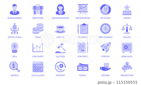 Business essential web icons set in duotone flat design. Pack pictograms with businessman, briefcase, presentation, award, office chair, money, coffee, planning, startup, other. Vector illustration.