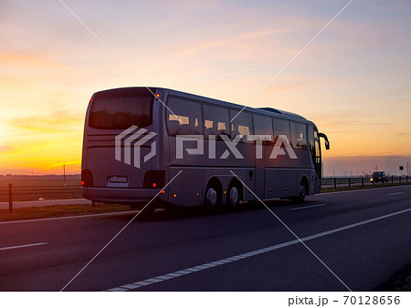 A large comfortable passenger bus against the orange sky with sunset rides on the highway. The concept of European passenger transportation in companies, e-ticket