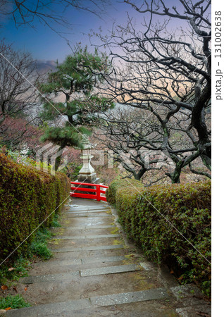 中山寺梅林公園の雨しぐれ後の風景、燈籠、3月11日、日本