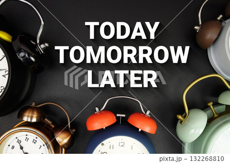 Today Tomorrow Later text with alarm clock on black background