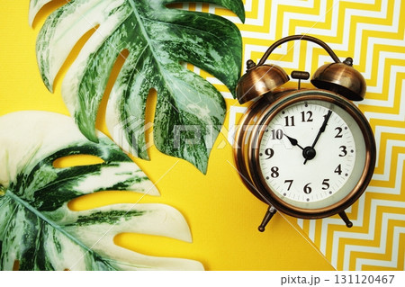 Alarm clock with Monstera Leaves on yellow background