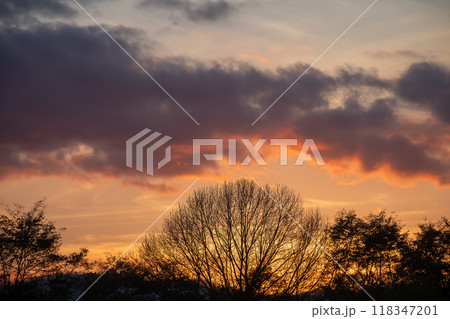 美しい秋の夕暮れの空と冬木立のシルエット