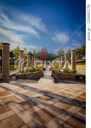 荒牧バラ公園の石柱と影模様、10月21日、伊丹市、日本