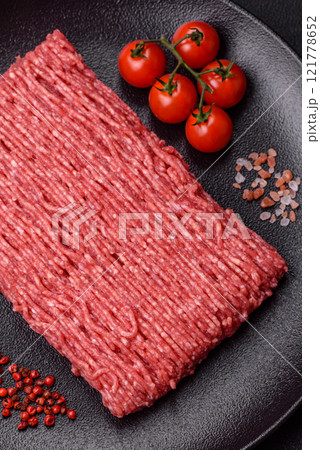 Raw ground beef or pork with salt, spices, herbs and tomatoes