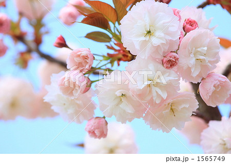 満開の八重桜(普賢象)のクローズアップ 【青空背景】