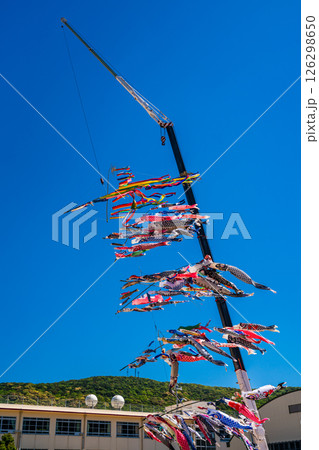 戸町中学校のクレーン鯉のぼり【長崎市】