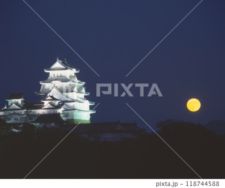 「世界文化遺産」「国宝」姫路城とスーパームーン(景福寺公園展望台より/姫路城十景の地の一つ)