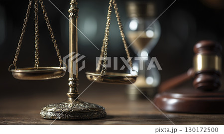 Close up of brass balance scale with ornate base, symbolizing justice and fairness, placed on wooden surface with blurred background including hourglass and gavel, evoking themes of law and time